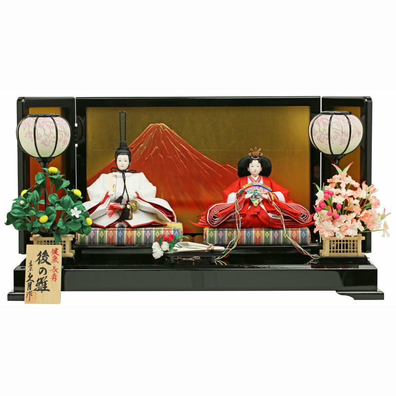 こちらの「大人の雛まつり 重陽の節句」シリーズの「後(のち)の雛 親王飾り」は、お目出度い“赤富士”がデザインされた金屏風セットに、上質衣装を身にまとった、束帯十二単(男雛の正装が「束帯」に対して、女雛の正装が「十二単」です。
